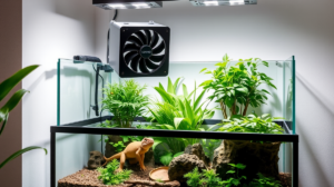 Die Installation eines Luftreinigers kann helfen, die Luftqualität zu verbessern. Für eine gute Zirkulation sorgen auch strategisch platzierte leise Ventilatoren, die die Luft bewegen, ohne die Reptilien zu stören.